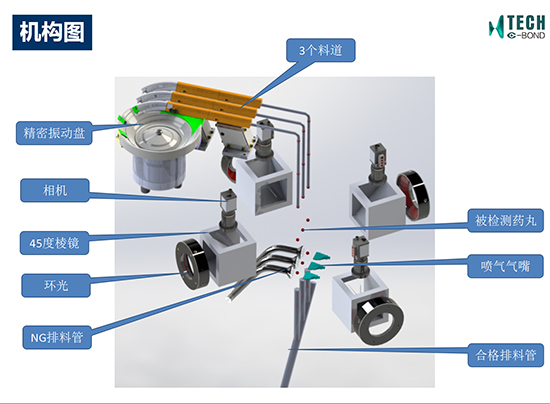 在藥粒檢測過程中,需進(jìn)行藥粒上白點(diǎn)、藥粒圓不圓、藥粒的粘連、藥粒的色澤正確等功能,檢測完成后輸出OK、NG信號(hào),在排廢位進(jìn)行剔除動(dòng)作。系統(tǒng)采用進(jìn)口工業(yè)相機(jī)快速獲取產(chǎn)品圖像,通過圖像識(shí)別、分析和計(jì)算,輸出檢測信號(hào)。 二、【藥粒檢測系統(tǒng)結(jié)構(gòu)圖】