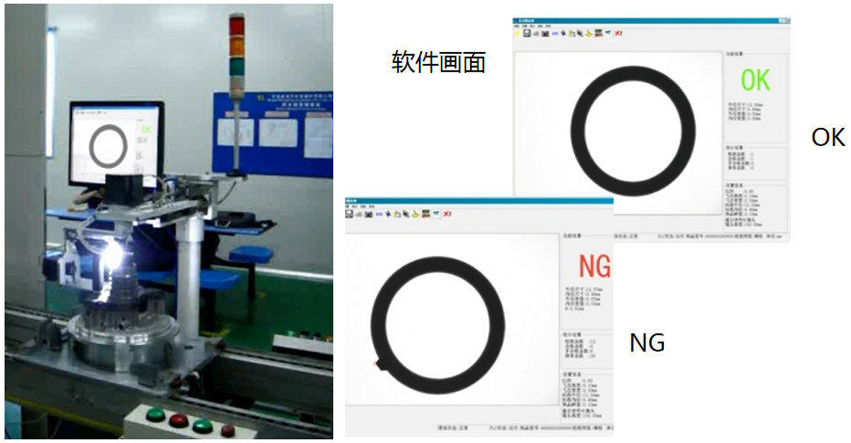 “密封圈缺陷視覺(jué)檢測(cè)系統(tǒng)”針對(duì)密封圈質(zhì)量(邊緣缺口毛刺、內(nèi)外徑尺寸)進(jìn)行檢測(cè)。相機(jī)快速采集生產(chǎn)線上密封圈圖像,將圖像數(shù)據(jù)傳送到圖像處理系統(tǒng),圖像處理系統(tǒng)對(duì)每幅圖像進(jìn)行預(yù)處理、尺寸測(cè)量等運(yùn)算,通過(guò)與標(biāo)準(zhǔn)模板圖像及設(shè)定參數(shù)進(jìn)行比較,來(lái)判斷產(chǎn)品是否合格,輸出廢品報(bào)警信息及剔廢控制信號(hào),由機(jī)械系統(tǒng)剔除廢品,從而保證密封圈質(zhì)量。本系統(tǒng)主要應(yīng)用于各類(lèi)規(guī)格密封圈生產(chǎn)過(guò)程中的缺陷檢測(cè),并可延伸至相關(guān)產(chǎn)品或行業(yè)的應(yīng)用中。