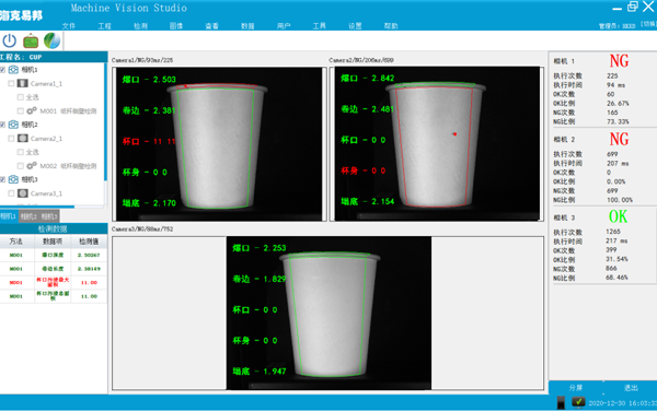 功能:紙杯外側(cè)壁缺陷檢測(cè)、污漬檢測(cè),檢測(cè)結(jié)果IO信號(hào)輸出。